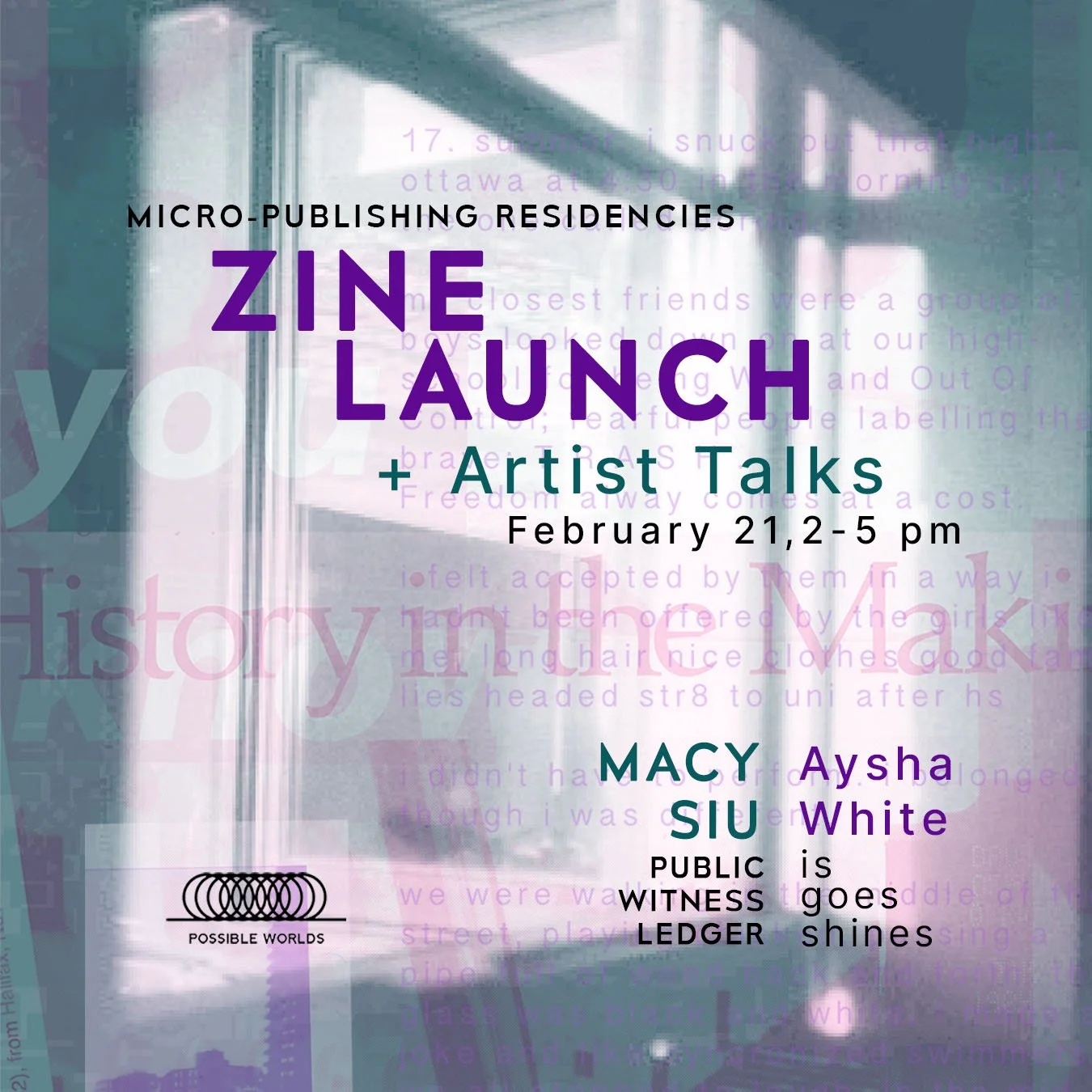 Join artists Macy Siu and Aysha White for the launch of their respective zines printed and published by Possible Worlds, Public Witness Ledger and is, goes shines. These zines are the culmination of micro-artist residencies that took place at Possible Worlds in summer 2025.